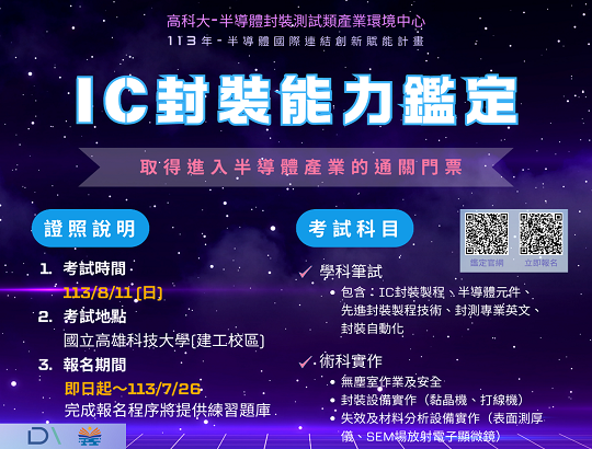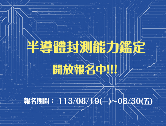 為提升半導體封測人才專業與實作能力,於9/14辦理「半導體封測能力鑑定」。點擊查看更多相關訊息點我查看報名連結報名期間:113/08/19(一)~08/30(五)學科筆試:113/09/14(六)10...
